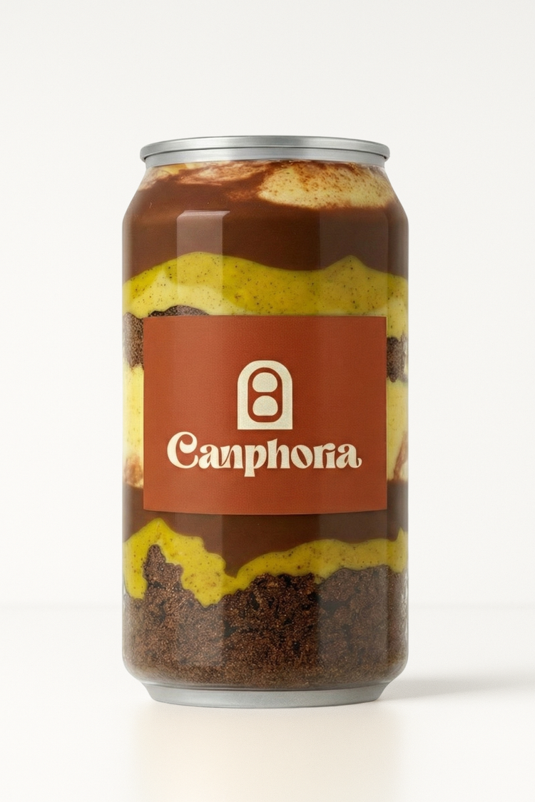 Un gâteau en canette (can-cake) au chocolat, composé de plusieurs couches gourmandes, surmonté d’une crème mascarpone à la pistache. Le tout est nappé d’un duo de coulis pistache et chocolat, agrémenté de kadaif croustillant et de morceaux de fraises fraîches.